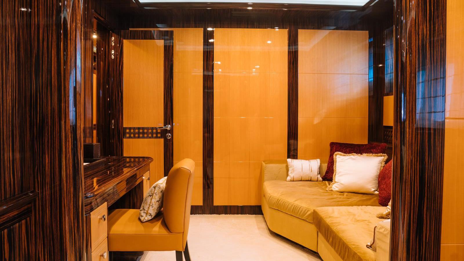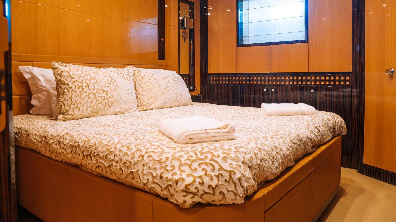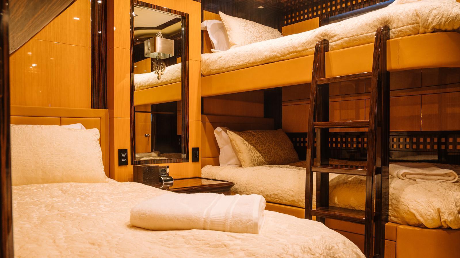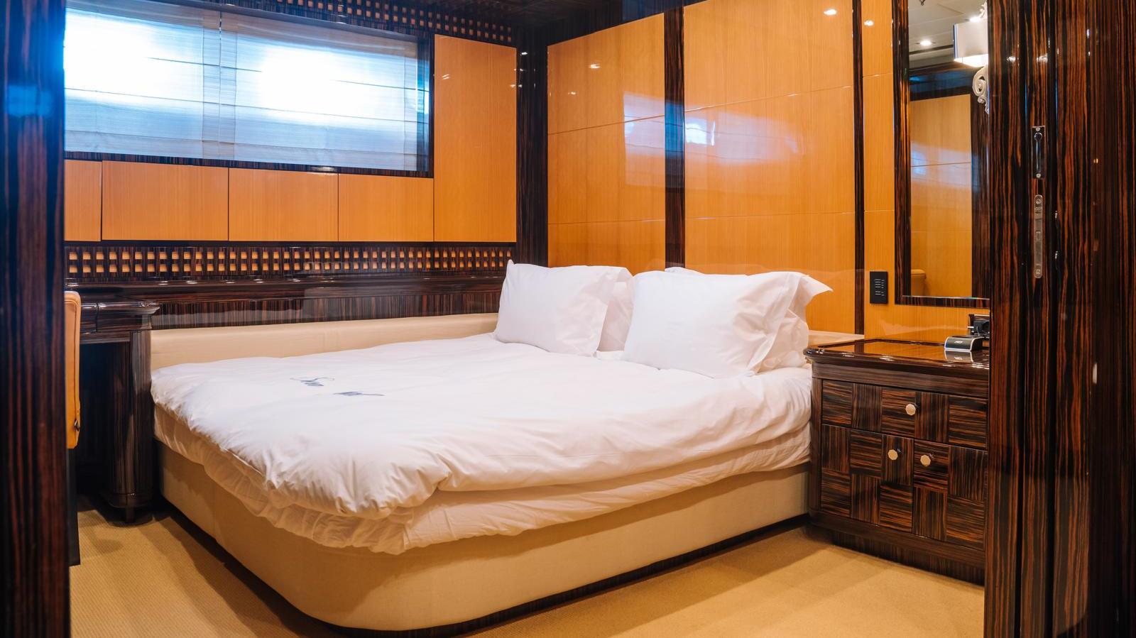 Inside, guests are welcomed into a world of refined elegance with 6 luxurious cabins that comfortably accommodate up to 12 guests. Each cabin is climate-controlled with full air conditioning and supported by 3 x 55 kW generators, ensuring uninterrupted comfort at sea. A fully equipped galley and separate crew quarters provide privacy and seamless service from a professional crew.